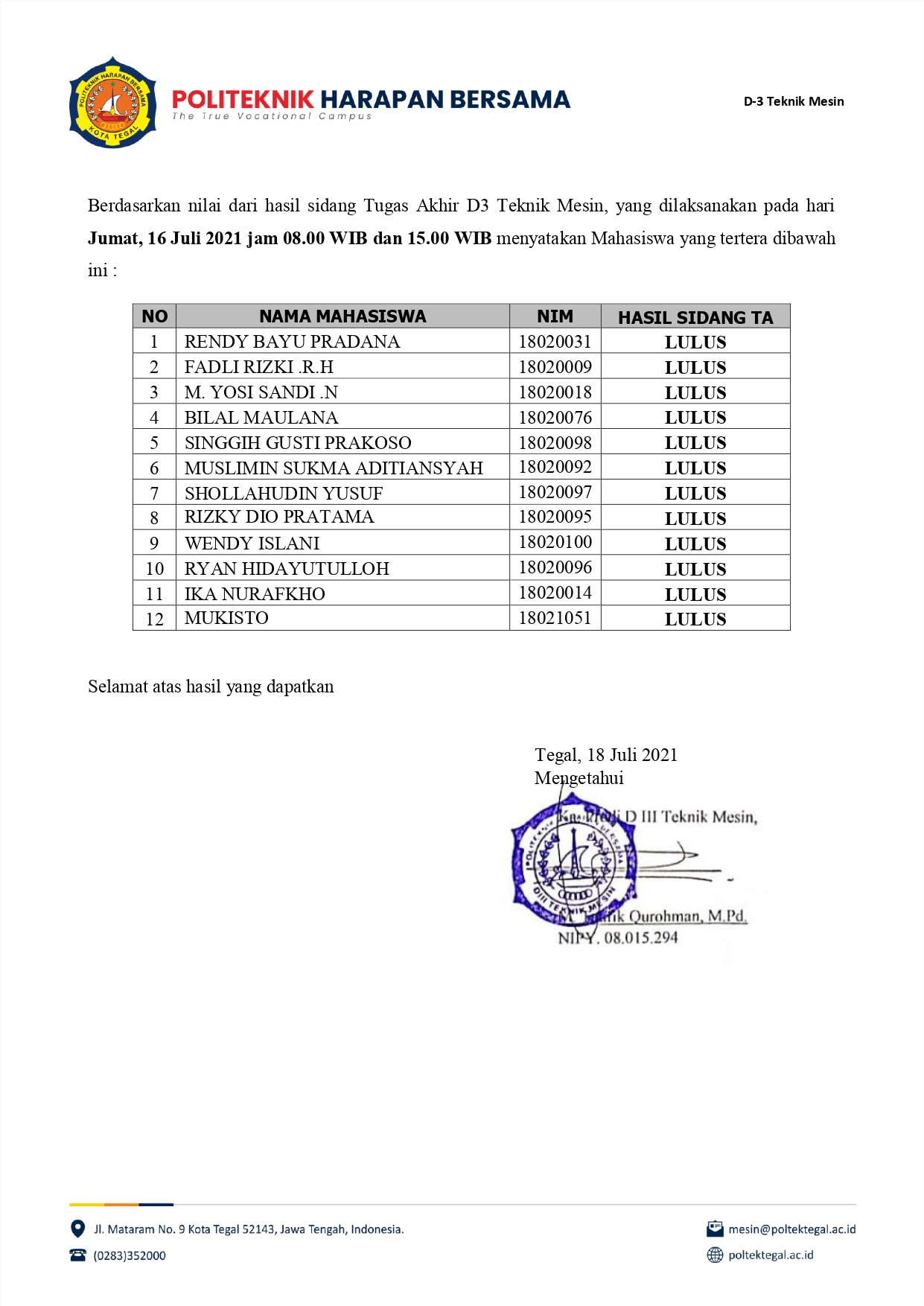 19 Juli 2021 - 10:44:05 WIB 0 Prodi D-3 Teknik Mesin