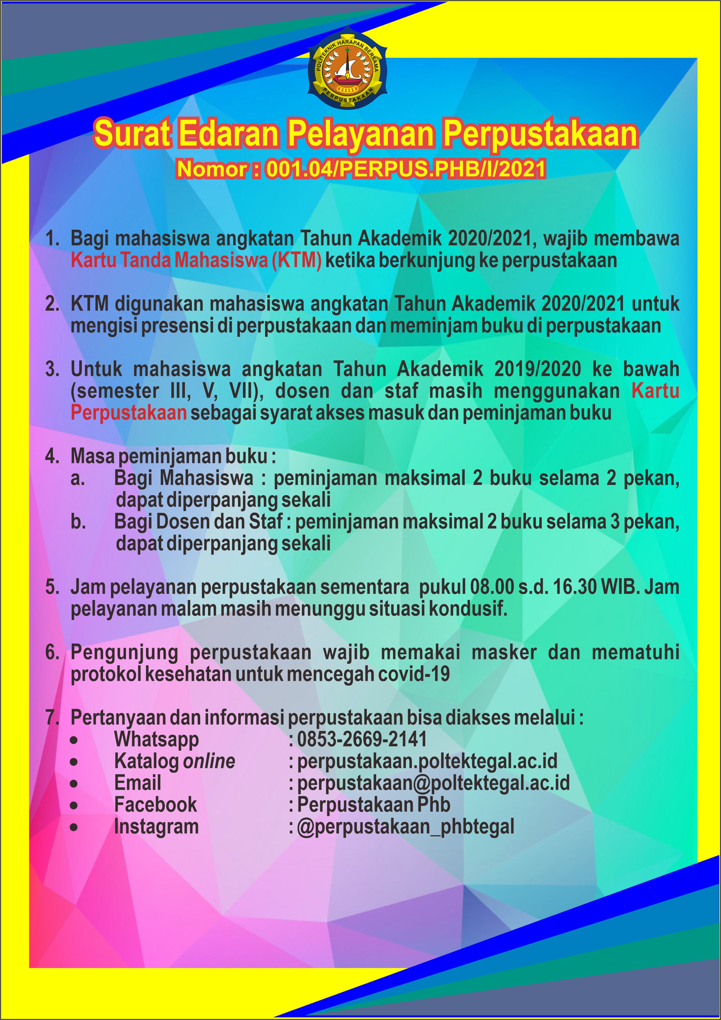 Berikut adalah isi Surat Edaran Nomor : 001.04/PERPUS.PHB/1/2021, Tentang Pelayanan Perpustakaan Politeknik